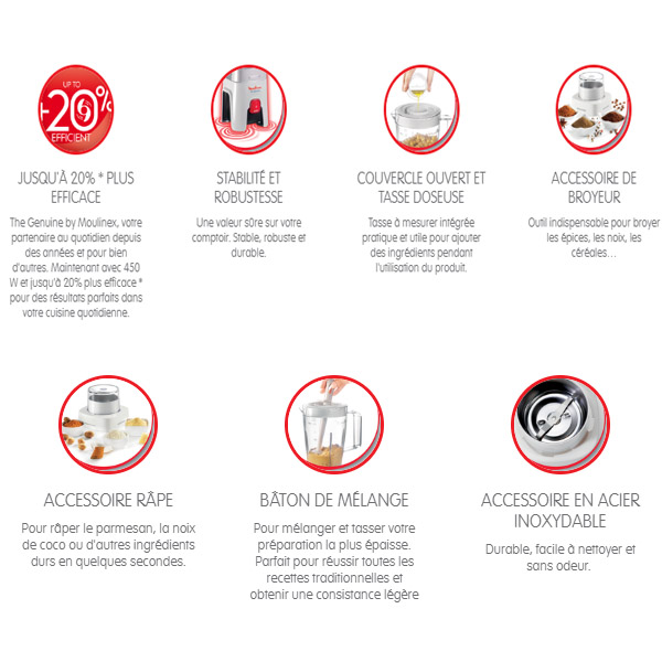 Une référence dans la cuisine depuis des années … et pour bien d’autres. Maintenant avec un moteur de 450 W et jusqu’à 20% plus efficace, pour des résultats parfaits dans votre cuisine quotidienne.