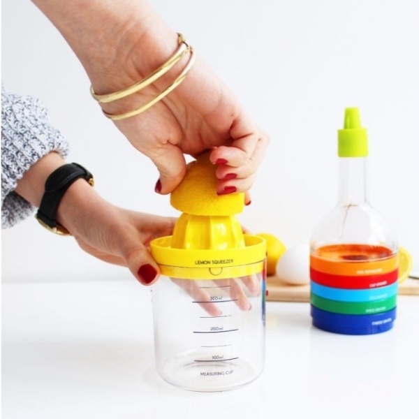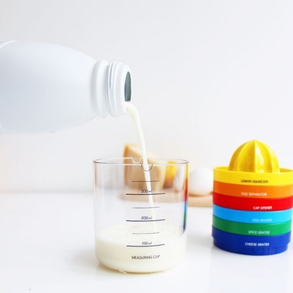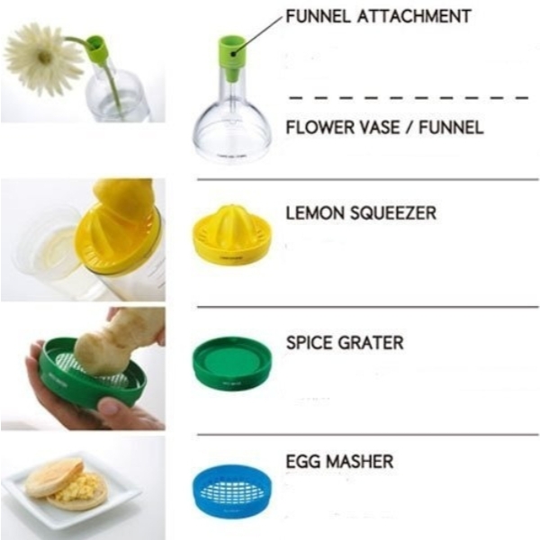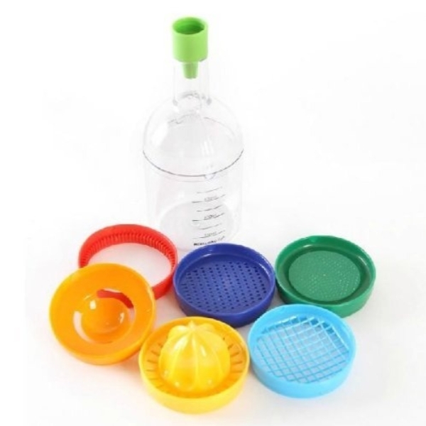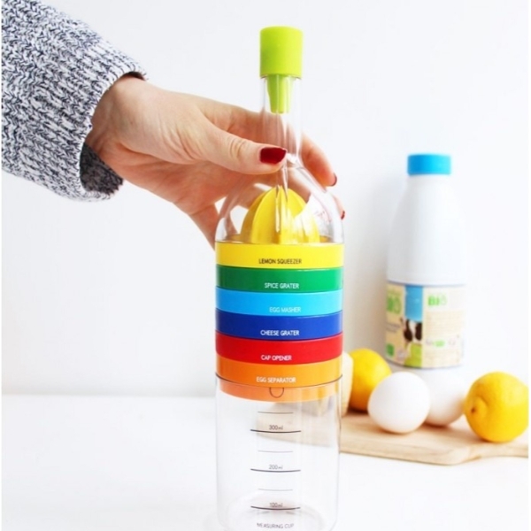 – 8 fonctions en 1 bouteille de taille 1L : 1 entonnoir, 1 presse-agrumes, 1 râpe à épices, 1 écraseur, 1 râpe à fromage, 1 ouvre-pot, 1 séparateur d’œuf et 1 verre mesureur.