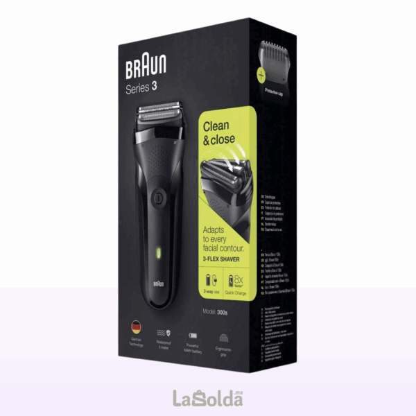 Le Braun Series 3 est livré avec une batterie intégrée et un capuchon de protection, le tout dans un format compact (6 x 3 x 3 cm) et léger (323 g). Compatible avec une tension 100-240V grâce à sa prise intelligente, il est parfait pour les voyages.