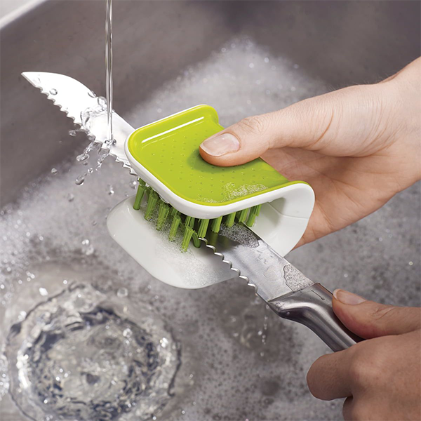 – Le nettoyage des couverts et particulièrement des couteaux peut s’avérer dangereux avec une éponge traditionnelle. Mais cette brosse innovante rend cette tâche beaucoup plus sûre et rapide. Le design enveloppant unique vous permet de nettoyer simultanément les deux côtés d’un couvert tout en évitant que vos doigts ne touchent le tranchant. Ses poils robustes éliminent rapidement les débris alimentaires et la poignée texturée vous confère une bonne préhension. Après utilisation, la brosse peut être placée verticalement sur un égouttoir : facile à ranger elle ne prend pas de place et reste à portée de main à côté de l’évier.
