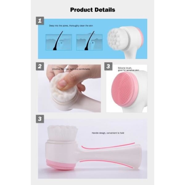 – Double Face : Un côté est fait avec environ 250 000 morceaux de fibre douce, brosse en microfibre qui nettoie efficacement les pores sans irriter la peau. Un autre côté est fait avec du silicone doux, brosse en silicone qui aide à promouvoir la circulation sanguine, soulager la pression cutanée, favoriser l’absorption des produits de soins de la peau.