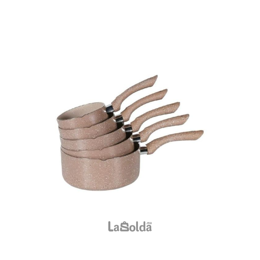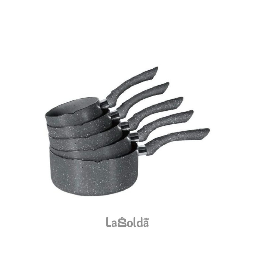 Ce lot comprend cinq casseroles de tailles différentes : 12, 14, 16, 18 et 20 cm. Vous disposez ainsi de l’ustensile adapté à chaque préparation, qu’il s’agisse de sauces, de soupes ou de plats mijotés. La conception en granit offre une excellente durabilité et une résistance accrue aux rayures.
