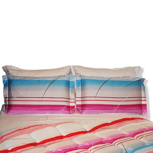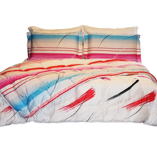 Magnifique couette chaude en 100% serge satin coton imprimé deux faces avec ses 2 taies d’oreiller. Cette couette, au toucher soyeux, dispose d’une face à motifs plumes en couleurs et d’un verso à rayures en couleurs également. Elle est travaillée en utilisant les dernières technologies allemandes, lui donnant un fini géométrique de piquage. Ce produit de très haute qualité, dont le tissu est d’origine européenne et le garnissage en dacron anti-allérgique, résiste aux lavages répetitifs.