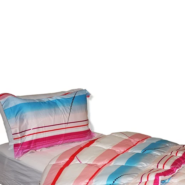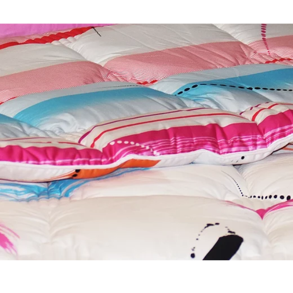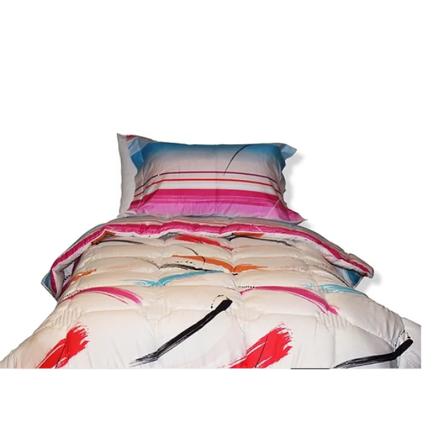 Magnifique couette chaude en 100% serge satin coton imprimé deux faces avec son 2 taie d’oreiller. Cette couette, au toucher soyeux, dispose d’une face à motifs plumes en couleurs et d’un verso à rayures en couleurs également. Elle est travaillée en utilisant les dernières technologies allemandes, lui donnant un fini géométrique de piquage. Ce produit de très haute qualité, dont le tissu est d’origine européenne et le garnissage en dacron anti-allérgique, résiste aux lavages répetitifs.