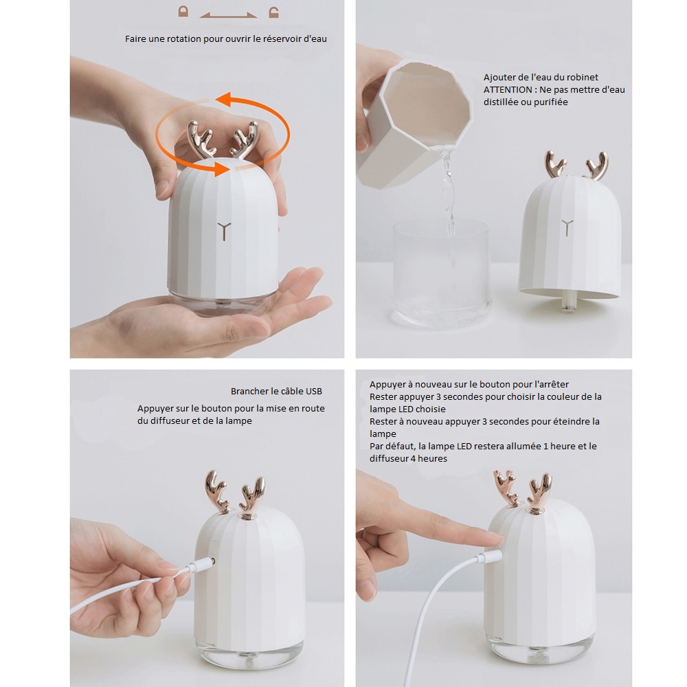 Créateur d’ambiance avec l’éclairage multicolore, apaisant par sa brume légère, il est doté d’une fonction timer qui agit sur la diffusion et sur l’éclairage. Il est possible de diffuser avec ou sans éclairage, ou de conserver l’éclairage avec ou sans diffusion. Vous pouvez également choisir un éclairage à variation de couleur ou fixé sur une couleur.