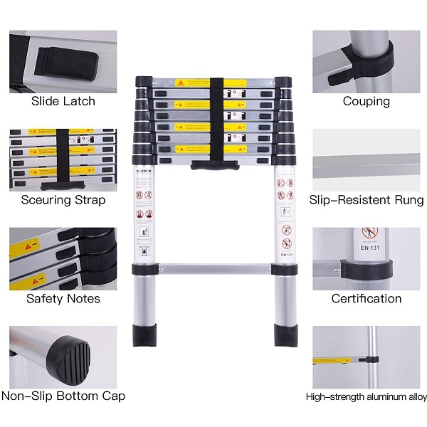 Nos échelles télescopiques sont conformes avec les normes EU les plus strictes pour garantir la meilleure qualité et une sécurité 100% pendant usage. Cette échelle a été approuvé par SGS et même CE. Cela signifie que cette échelle télescopique est conforme avec les normes EN-131 et elle possède tous les aspects de sécurité qu’une échelle doit avoir.
