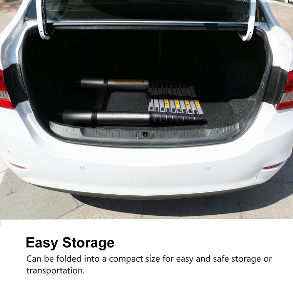 Cette échelle télescopique est munie d’un système qui protège vos doigts quand vous la déplier afin d’empêcher des accidents. Il y a des petits embouts entre chaque échelon qui empêchent que les échelons tombent sur vos doigts. Chaque niveau rétractable est aussi muni d’un mécanisme de sécurité qui verrouille automatiquement l’échelle quand elle est dépliée. L’échelle de 3,8 m peut être plié vers une hauteur de 95cm pour un rangement et transport facile. L’échelon du bas est muni d’un stabilisateur extra large avec des semelles en caoutchouc pour garantir plus de stabilité et de sécurité. Ce stabilisateur est amovible.