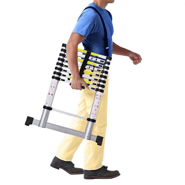 Cette échelle télescopique est munie d’un système qui protège vos doigts quand vous la déplier afin d’empêcher des accidents. Il y a des petits embouts entre chaque échelon qui empêchent que les échelons tombent sur vos doigts. Chaque niveau rétractable est aussi muni d’un mécanisme de sécurité qui verrouille automatiquement l’échelle quand elle est dépliée. L’échelle de 4,4 m peut être plié vers une hauteur de 95cm pour un rangement et transport facile. L’échelon du bas est muni d’un stabilisateur extra large avec des semelles en caoutchouc pour garantir plus de stabilité et de sécurité. Ce stabilisateur est amovible.