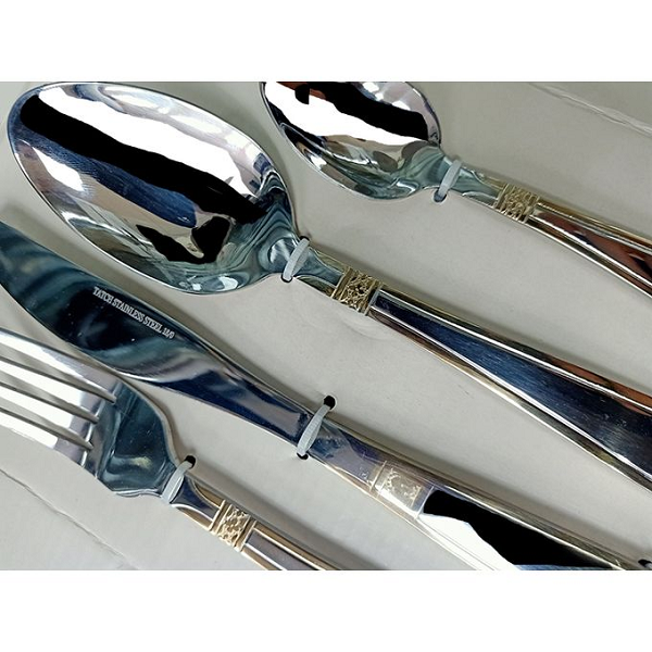 Ménagère élégante en or pour 6 personnes Un ensemble complet pour le quotidien ou les occasions spéciales Bonne prise en main, combinaison parfaite et standard Fabrication de qualité : acier inoxydable brossé et passe au lave-vaisselle, pas de goût métallique Sain pour un usage quotidien Le parfait compagnon de table, de l’apéritif au dessert Idée cadeau sympa et conviviale