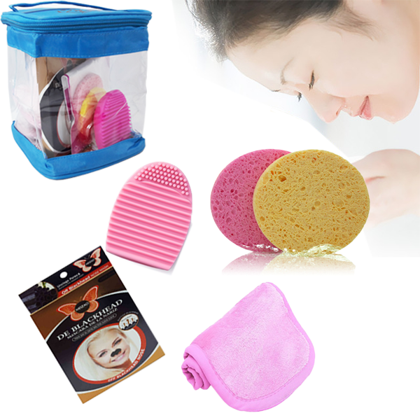 Kit Nettoyage Visage : serviette magique démaquillante + 2 éponges de nettoyage Visage + Brosse En silicone Multifonction + Masque Nez Anti-Points Noirs 5 Pièces + trousse