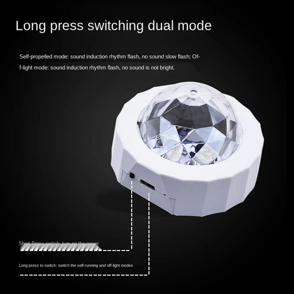 1. Son activé: la boule disco a deux modes, Flash & stroboscope/Off & stroboscope, la balle stroboscope à la musique, et s’il n’y a pas de musique, la balle clignote lentement/s’éteint selon le mode.