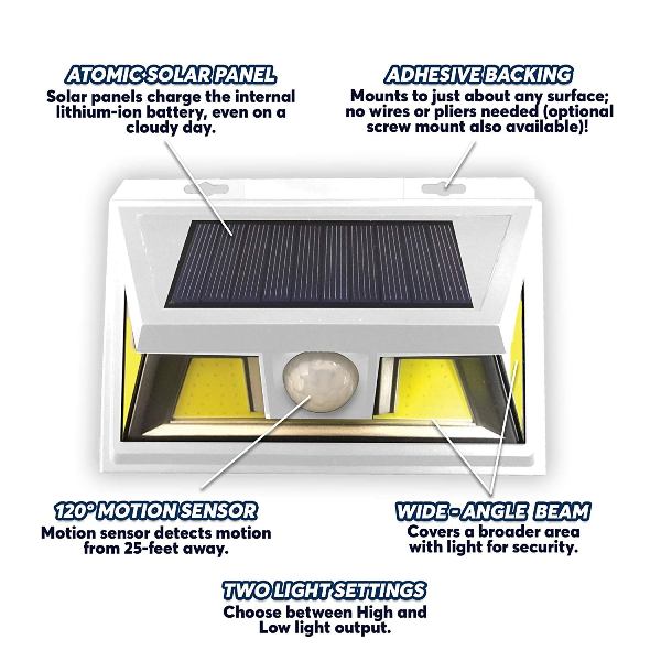 Vous cherchez une lampe de sécurité? Cherchez pas plus loin. Atomic Beam SunBlast dispose d’un capteur de mouvement ultramoderne à 120 degrés. La lumière extérieure s’allume chaque fois que vous vous approchez, puis s’éteint lorsque vous disparaissez. Atomic Beam SunBlast détecte les mouvements à une distance de 10 mètres. C’est l’éclairage de sécurité idéal pour votre garage, votre patio, votre porte arrière, votre porte pour chien, votre cabanon et plus encore!
