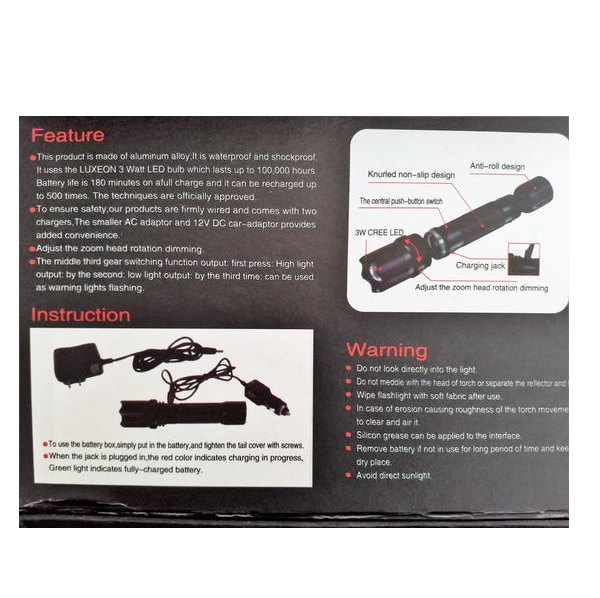 – Alimentation: 1x chargeur allume-cigarette de voiture / 1x chargeur domestique Li-ion 3000mAh 3.7V 18650 OU 1x piles AAA