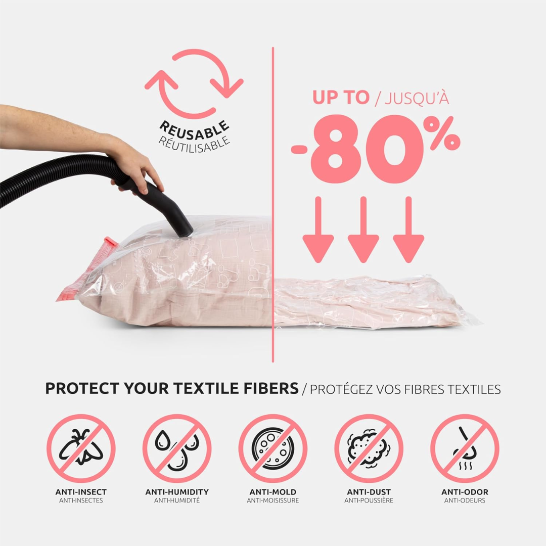 • Pour bien ranger : vos linges dans une petite armoire ou un coin de placard, ces sacs sous vide protègent vos linges contre l’humidité ou l’attaque d’insectes.Ils sont réutilisables et presque compatibles avec toute sorte d’aspirateur.