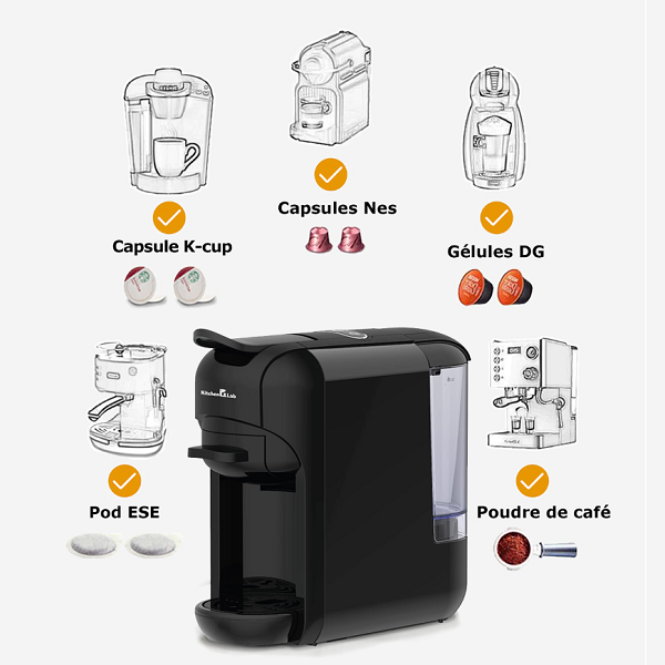 – Envie d’un café ? Que vous soyez adepte du café moulu, des dosettes, des Capsules Nespresso ou Dolce gusto, la machine à café KITCHEN LAB 4 en 1 est la solution idéale pour répondre à vos besoins.
