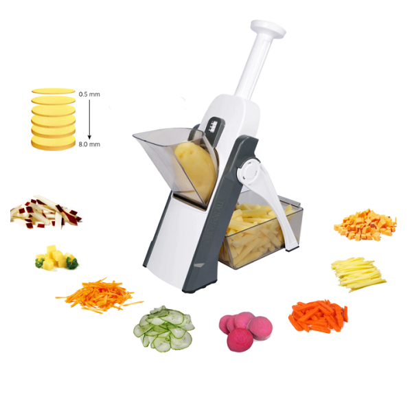 PRÉPAREZ FACILEMENT VOS SALADES DE CRUDITÉS ET FRITES : Ce coupe-légumes est l’appareil idéal en cuisine pour la découpe des légumes. Il permet de réaliser des rondelles, des cubes ou des frites en quelques secondes. Vous pouvez régler l’épaisseur des tranches de 0,5 à 8 mm. Un récipient permet de récupérer les aliments découpés.