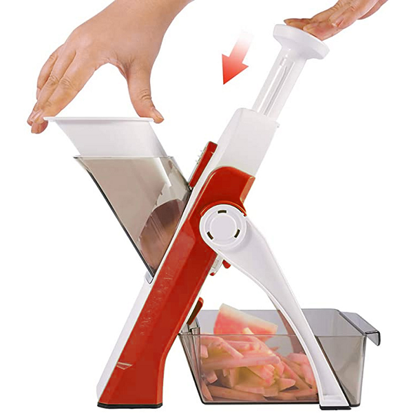 Facile à utiliser : ce coupe-légumes multifonction est simple à utiliser et ne nécessite pas le changement de lames pour chaque tranchage, il suffit de tourner le bouton et d’ajuster l’épaisseur des tranches qui s’accumulent directement dans le récipient en plastique.