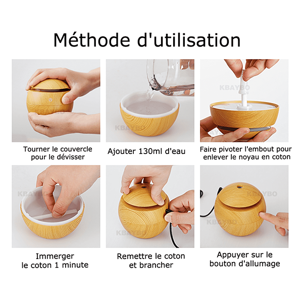 – Pour le faire fonctionner, ajoutez de l’eau dans le réservoir. Par la suite, ajoutez 2 gouttes d’huile essentielle. Refermez le diffuseur et lancez la diffusion.