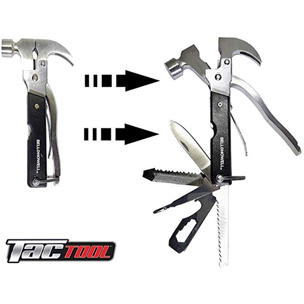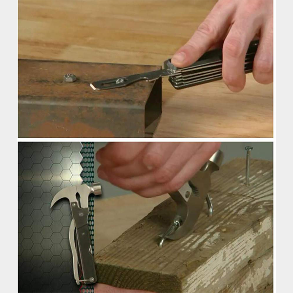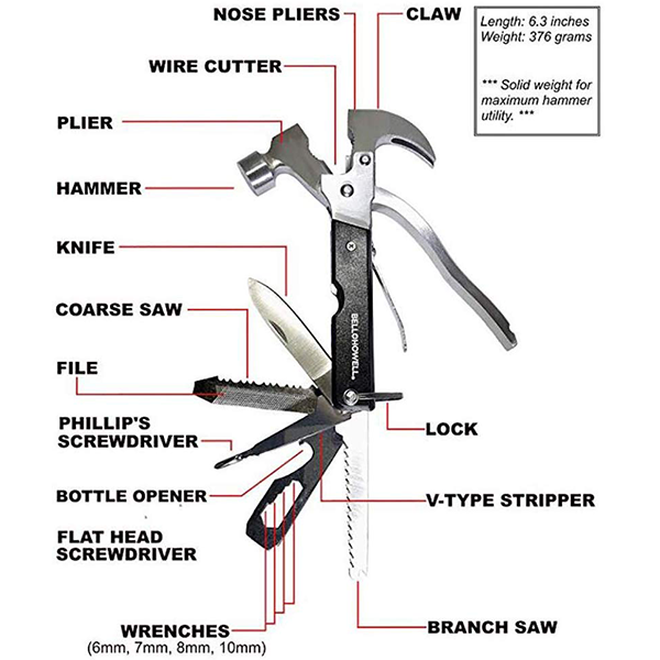 – Quel que soit le travail, vous serez préparé avec une lame de hache, un ouvre-bouteille, un marteau, un ciseau, une lame dentelée, une lime, 2 types de pinces, un tournevis à tête plate, un couteau et bien plus
