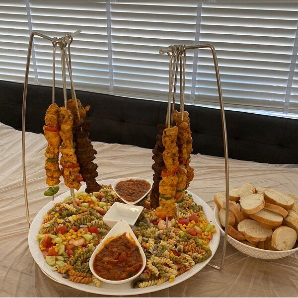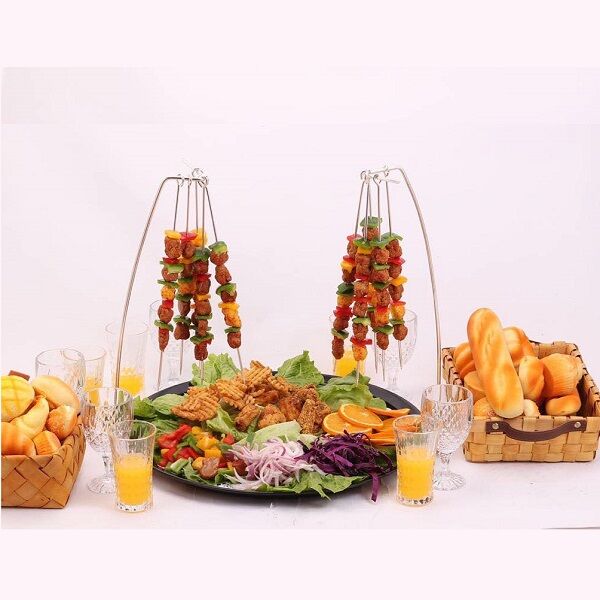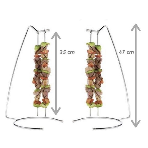 Un Support à brochettes ou porte-brochettes de 47 cm de haut avec 10 brochettes de 35 cm en acier inoxydable. Un joli standard pour présenter une savoureuse pièce de viande lors d’un BBQ ou autre occasion.