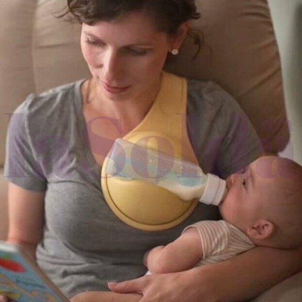 Il est à poser sur l’épaule, le biberon est à insérer dans la partie semi sphérique, partie qui peut être orientable comme on le souhaite