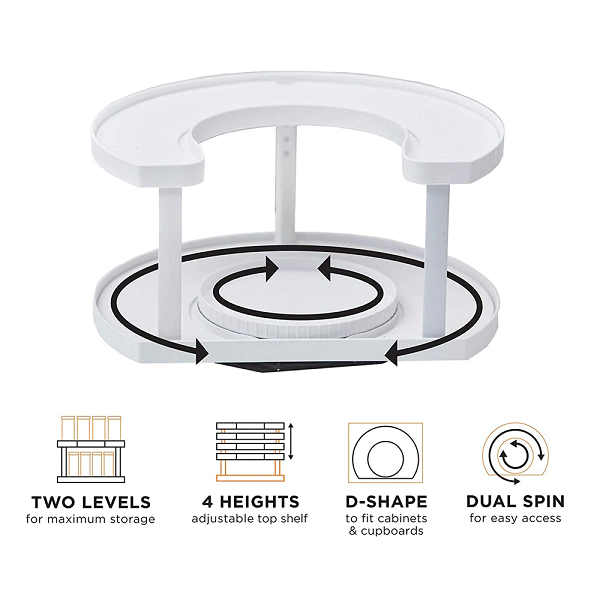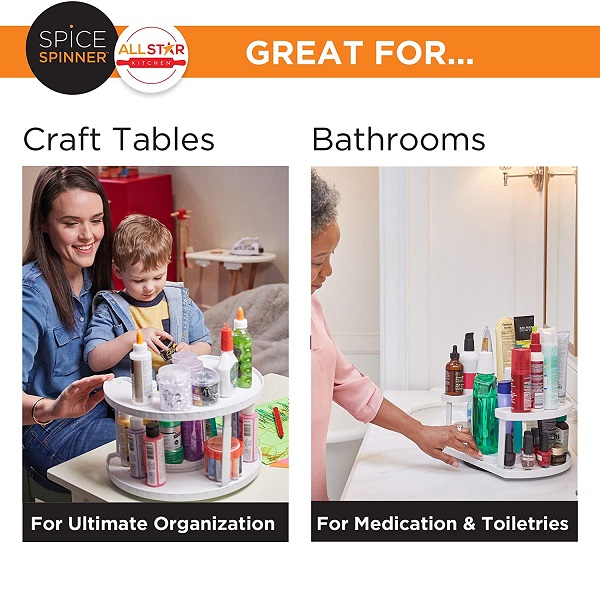 Transformez n’importe quel désordre en un chef-d’œuvre personnalisé! Construit de manière unique pour économiser de l’espace en s’encastrant contre n’importe quelle armoire ou placard pour contenir jusqu’à 40 épices et condiments. Tourne pour rapprocher les épices de vous.