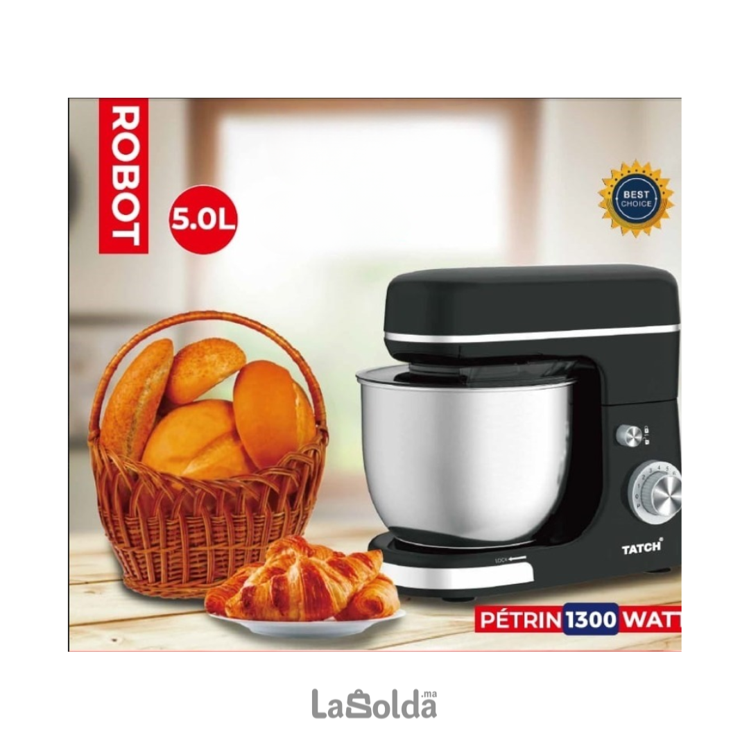 Robot pétrin 1300W avec bol inox 5L. Parfait pour pétrir, battre et mélanger.