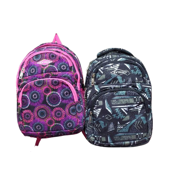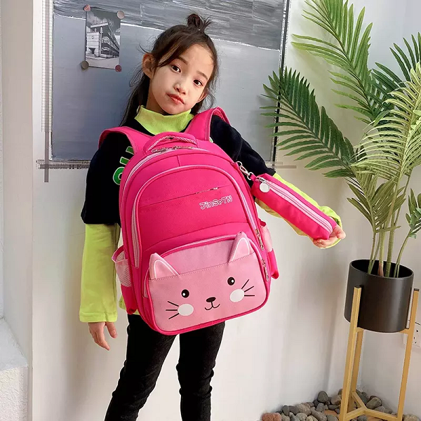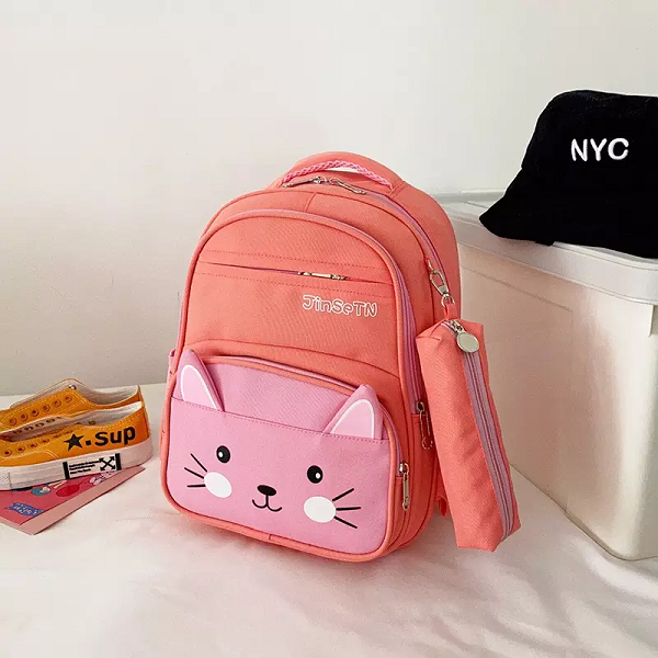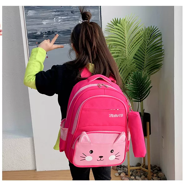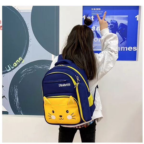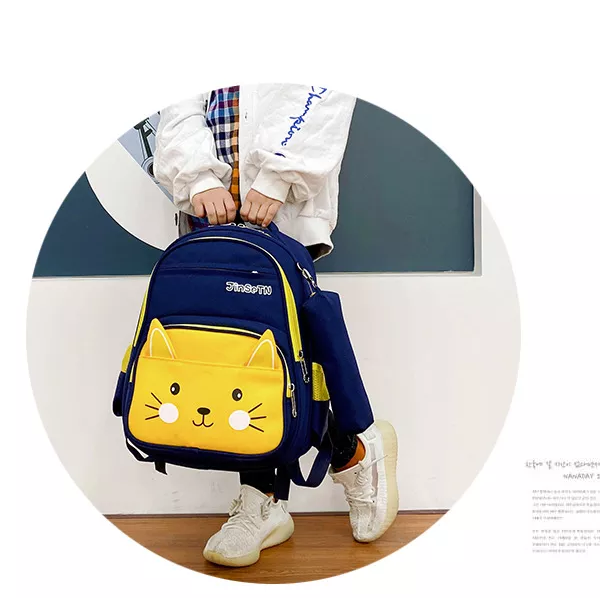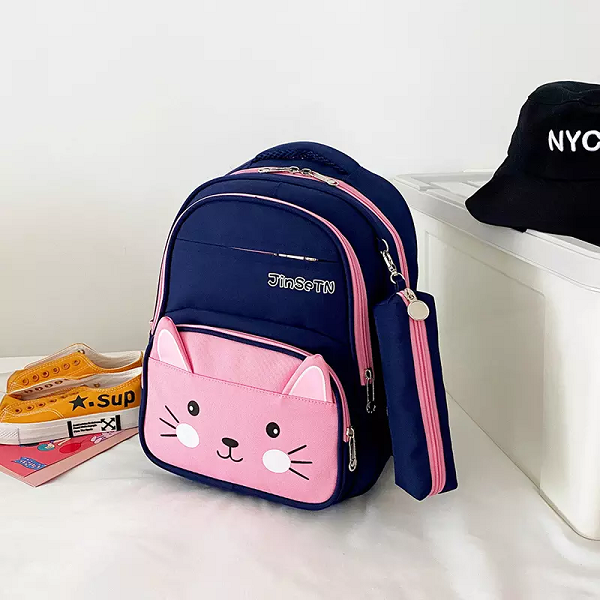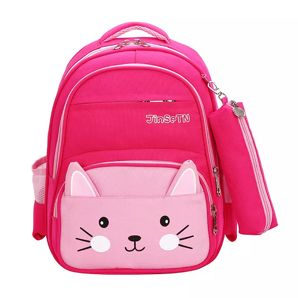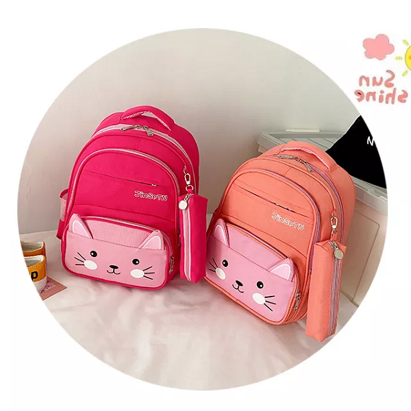 Sac à dos d’école combiné en nylon avec triple compartiment avec fermeture à glissière, imprimé avec une tête de chat et des oreilles saillantes, poignée en tissu et bretelles rembourrées réglables.