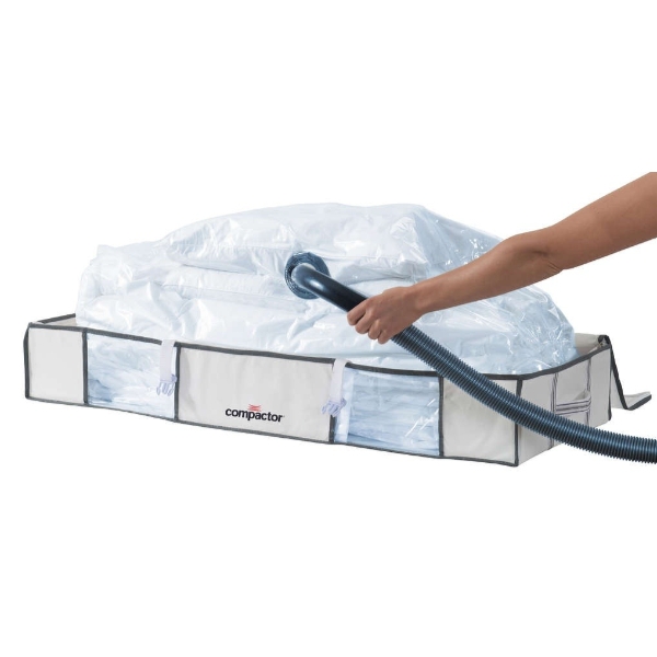 – Il vous suffit de disposer votre linge dans le sac de compression hermétique inclus avec la housse sous vide Compactor, de le fermer en zippant et d’aspirer l’air à l’aide de votre aspirateur. Pour cela rien de plus simple, ouvrez la valve, placez l’embout de votre aspirateur et faites le vide d’air puis refermez la valve. La fonction anti-retour de la valve permet de ne pas laisser le sac se regonfler lorsque vous arrêtez l’aspiration. Ce procédé permet de stocker votre linge tout en respectant la fibre textile.