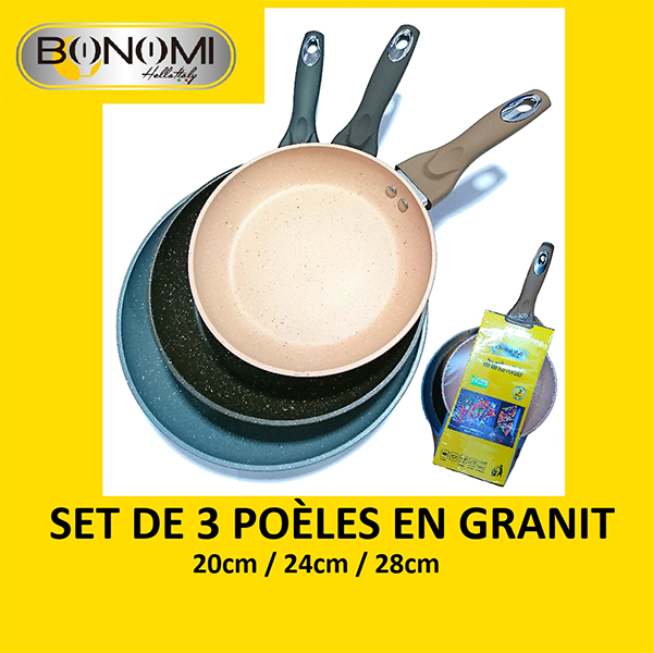Un ensemble pour cuisine composée de 3 poêles en granit idéales et très pratiques pour préparer vos repas avec un super design rond et 3 différentes dimensions pour vous faciliter de cuisinier comme vous désirez.