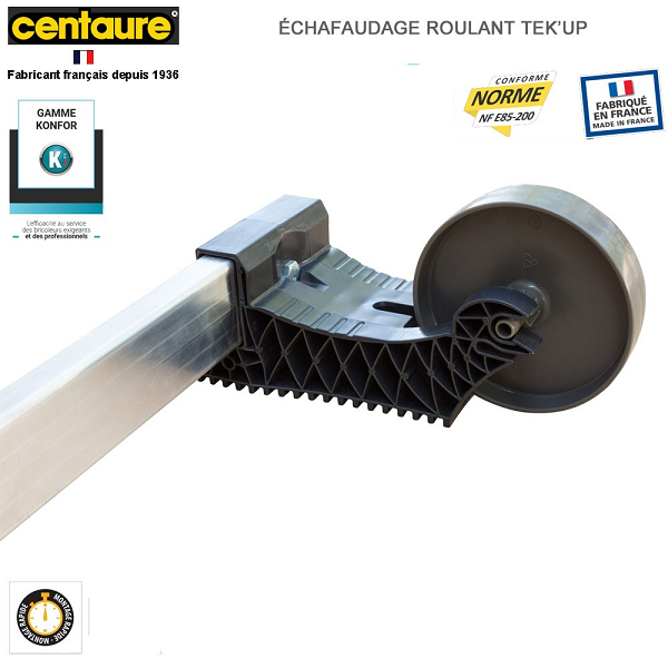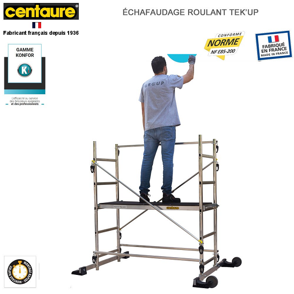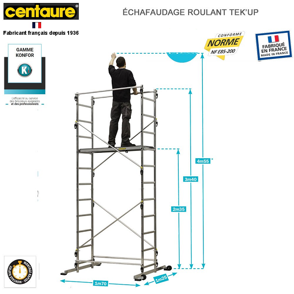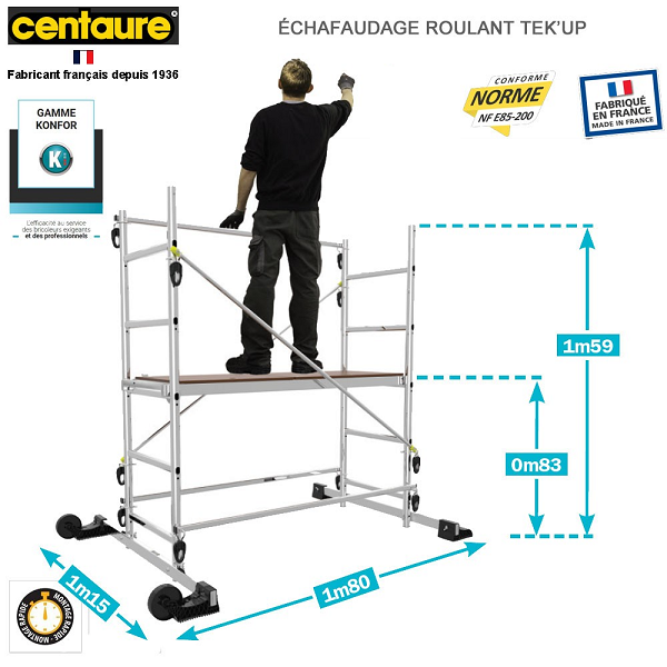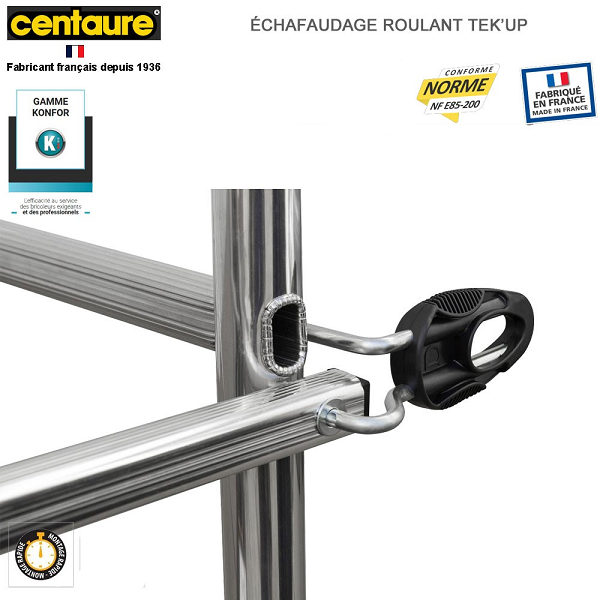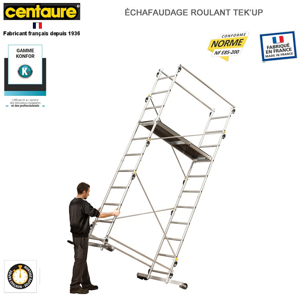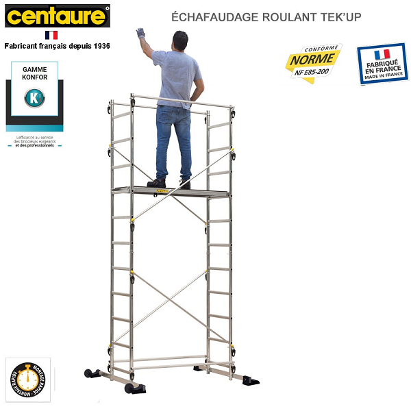 Conforme à la norme NF-E85 200. Charge maximale 150 Kg . Se monte rapidement grâce à des mains de verrouillage. Pré montées. Son plancher s’installe à différents niveaux jusqu’à 2m35.