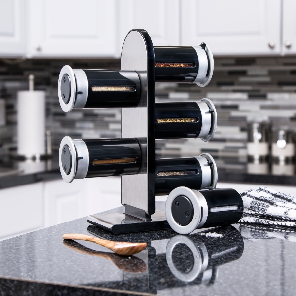 – Ce lot comprend 6 boîtes à épices, une étagère garniture en acier inoxydable, et des étiquettes auto-adhésives pour les épices