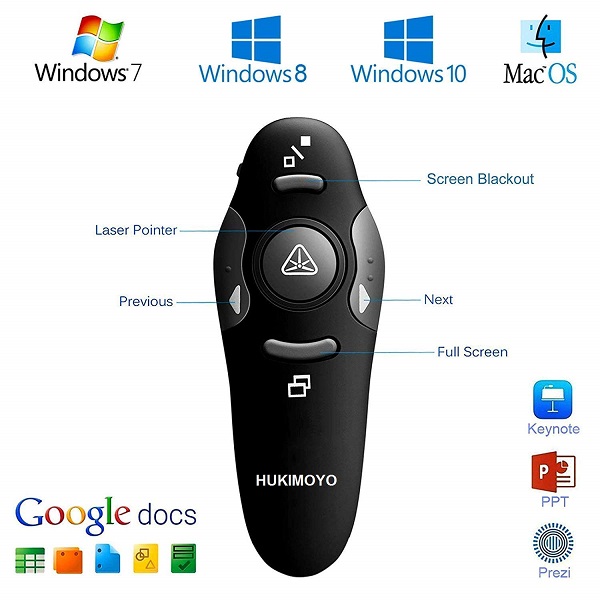 – Présentateur sans fil 2.4 GHz, avec une lumière rouge vive pour voir facilement la plupart des arrière-plans et des surfaces projectives.