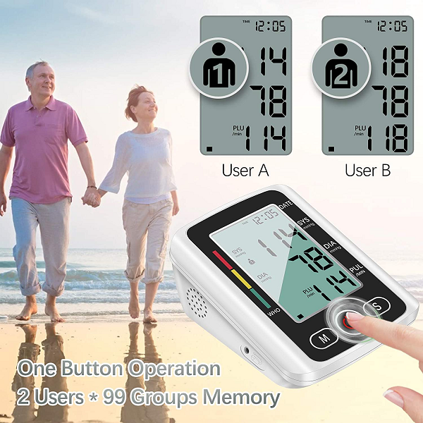 • 2 groupes de fonctions de mémoire : le sphygmomanomètre a une fonction double utilisateur, avec 2*99 groupes de groupes de mémoire, sélectionnez l’utilisateur A/B avant la mesure, afin que vous puissiez visualiser et enregistrer les résultats de mesure quotidiens à tout moment, et comprendre les vôtres état de santé.