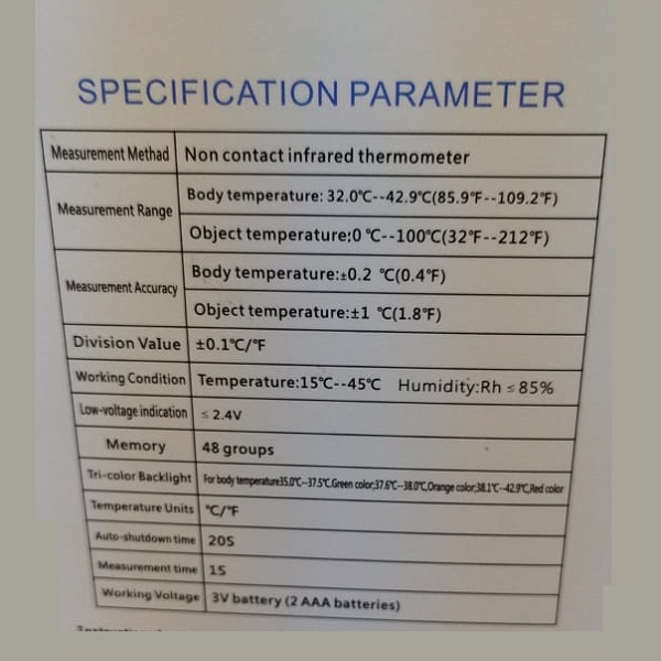 – Convient pour toutes les entrées de foyers , écoles , universités , banques , hôpitaux , hôtels et tous vos espaces de travail pour vérifier la température corporelle en moins d’ une seconde sans contact physique en le plaçant a distance du Front .